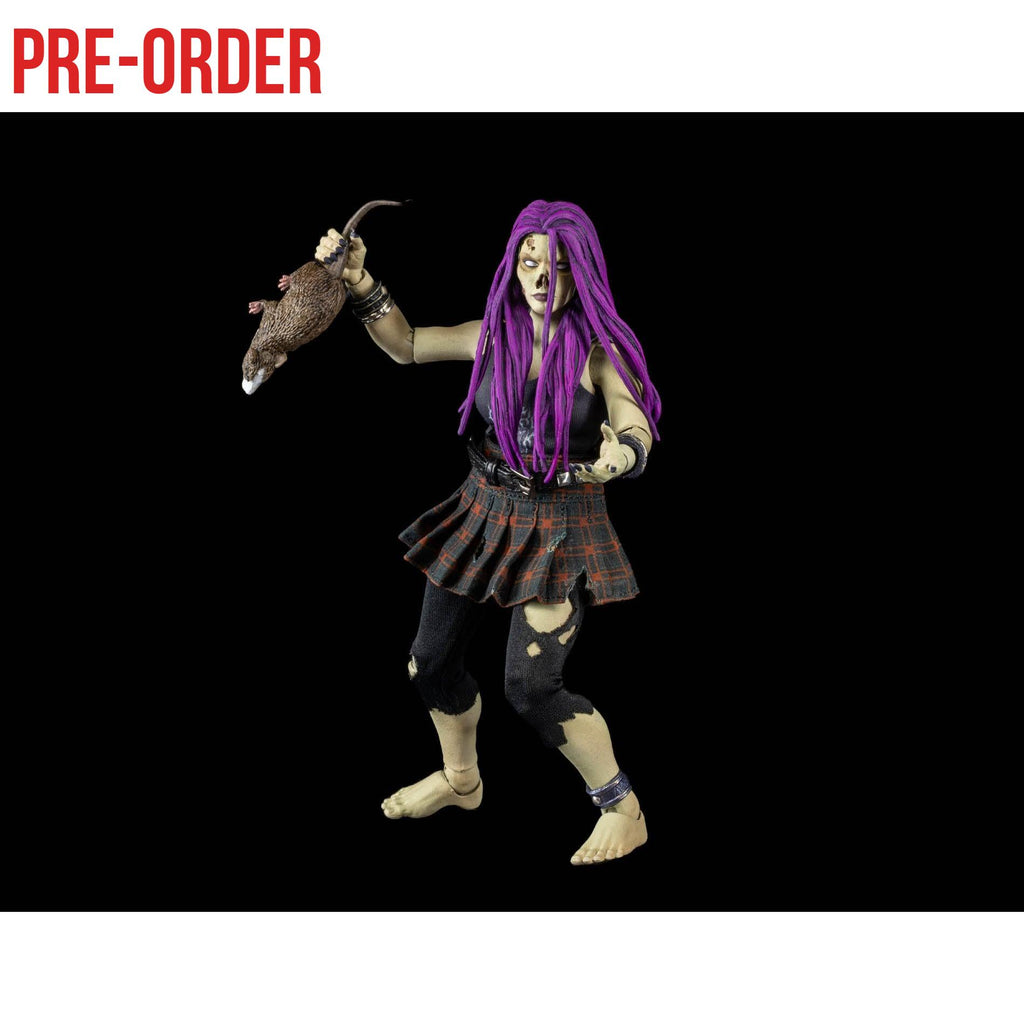 The female Rocker Zombie comes with 2 different heads, extra hands, a skeleton arm that can be used as a weapon or popped onto her lower arm, and 2 rats! She also comes with premium soft goods including a red plaid skirt, torn leggings, a studded belt, and a tank top with a cool death metal “FOUR HORSEMEN” logo on it!