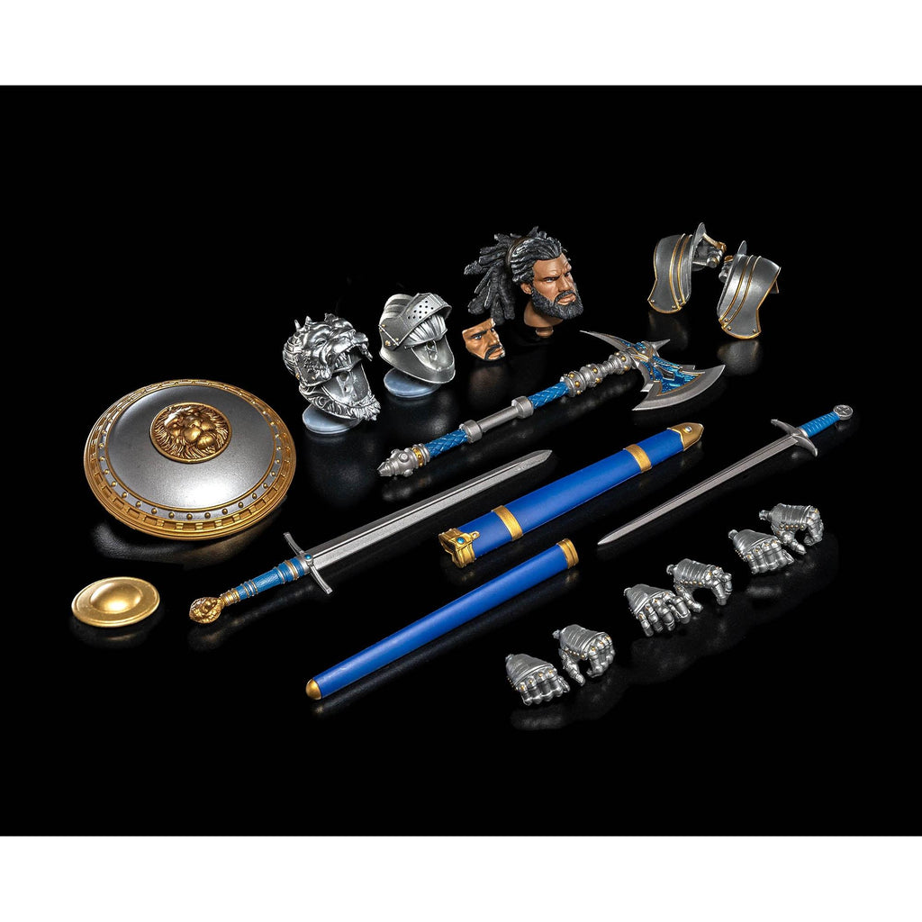 The Legacies of Mythoss: Otho figure comes with a newly sculpted head featuring this warrior’s distinctive look. The set also incudes 2 brand new helmets with flip-down visors, both of which can be used with the Otho “face plate” insert that is also included! As for weapons, Otho v2 comes with a broad sword and scabbard, standard sword and scabbard, a shield with 2 middle inserts (including a Leodysseus lion symbol), and a new battle axe. He also comes with extra hands and premium wired soft goods tunic and skirt.