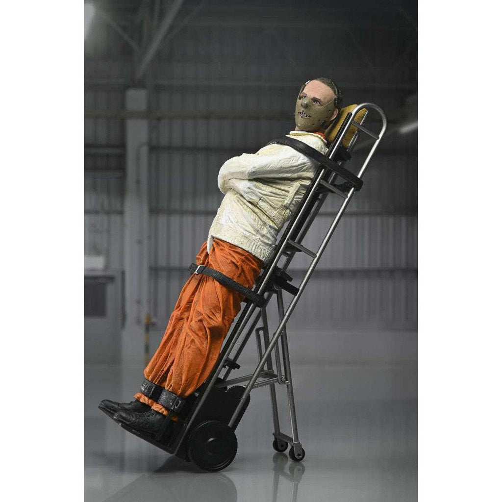 Add the iconic Hannibal Lecter to your horror collection! Portrayed by Oscar winner Anthony Hopkins, the brilliant and psychotic doctor from The Silence of the Lambs stands in his orange prison uniform and straight jacket. This chilling 7" scale figure by NECA is articulated for posing and comes with interchangeable heads, his trademark mask, and a dolly accessory for transporting him.