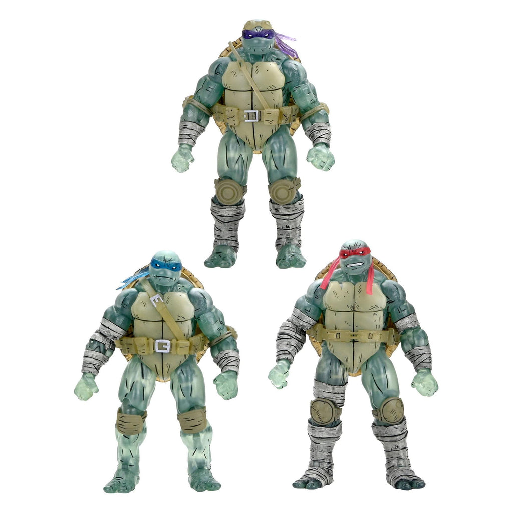 From the Teenage Mutant Ninja Turtles comic book series, The Last Ronin! Even though Michelangelo is the sole surviving Turtle in future NYC, Leonardo, Raphael, and Donatello live on in his memory. This Ghost Brothers action figure 3-pack from NECA features the characters commemorated in special spectral translucent plastic. The 7-inch scale figures include their signature weapons and extra hands and come in collector-friendly packaging with original artwork by The Last Ronin artist Ben Bishop.